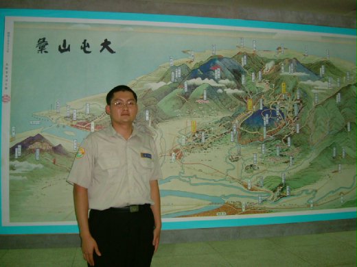 他帶我穿過二層「金庫大門」後,站在一幅「大屯山彙」的古地圖前擺出一個筆挺的英姿說:「這張地圖最漂亮」。