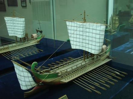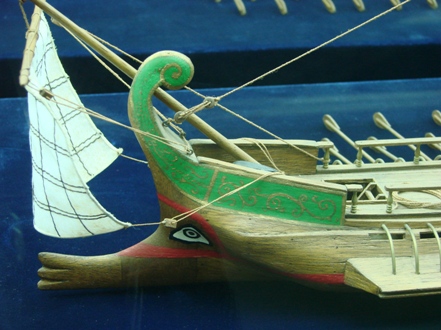 在海事館的圖書室裡收藏著有關「橈槳船」在海裡開戰的圖畫。羅馬戰船有一處最特別,就是船頭處伸出一枝「撞角」,這是古代羅馬水師在海戰中能切割敵船的利器,也是羅馬軍團的海上戰術,現在看起來有點可笑,但這隻猙獰的「眼睛」和突出的「撞角」造型非常有趣。