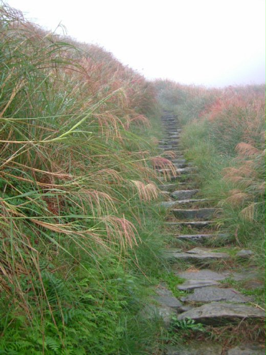 石階兩旁的芒草,比人還高,沾了水珠的穗子,不怕寒雨,一陣秋風來襲,就滿山搖曳,像是要甩掉秋愁一般。
