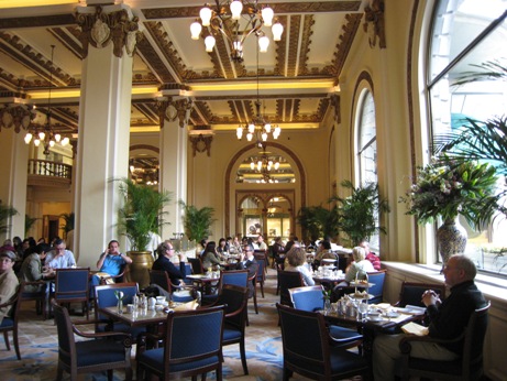 一樓大廳就是喝午茶的地方,米色系的廊柱和繪著金色唐草紋樣的天花板,配上光可鑑人的大理石地板及厚厚的地毯,頂上的吊燈散出柔和的光線,扶著古典石梯而上,有幾面明亮的大鏡子,反映出老派的浪漫主義調子。