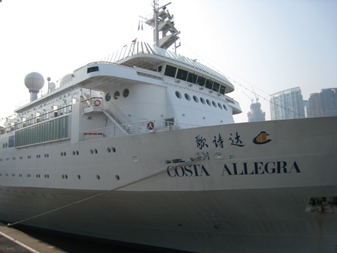 四月中旬,陽光和暖,把維多利亞港四周的摩登大樓照得發亮,天星碼頭的渡輪來來往往,很熱鬧,只有「郵輪碼頭」安安靜靜地泊著二艘白色的大郵輪,一艘是麗星郵輪 雙魚星號(Star Pisces),另一艘是義大利籍的歌詩達郵輪 愛蘭歌娜號(Costa Allegra)。
