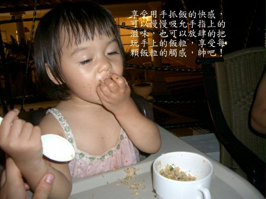 曾經讓老大放肆的抓飯,吃得滿臉都是飯粒,她越吃越開心,果然抓起飯來吃是種愉悅的感覺,當然最好不要在家裡嘗試,因為很難清理,台灣的米飯真的很黏,我還是希望她們在家就當個淑女吧!