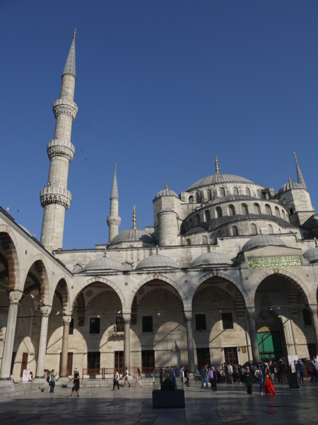 蘇丹阿赫密特清真寺(Sultanahmet Camii)到訪者眾多,正門只有信徒可以出入,觀光客有觀光客的通道和入口,並有頭巾、衣服出借。