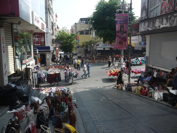 快走回旅館時,旅館後面的商店也都沒開,卻排滿了賣衣服、鞋子、皮包、手錶、香水等等的攤販,非常熱鬧。零星做生意的店家賣的是生活用品和食品,一家賣土耳其軟糖的櫥窗,標示著1公斤15TL;另外賣烤雞的,1隻烤雞只要6 TL,價格比起大街上的商店便宜許多。我們顯然跨進了當地庶民生活的場域,這兒的物品必然物廉價美,可是東西都買齊了。