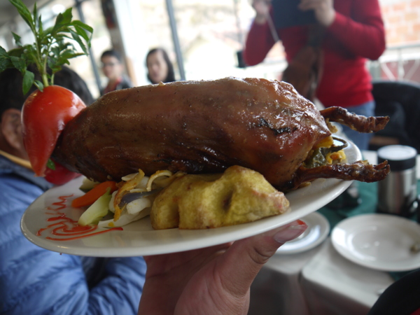 秘魯人吃天竺鼠,餐廳服務生端上一隻碩大無比的烤天竺鼠,待我們拍完照後,每人分到一小塊肉,淺嚐天竺鼠肉。
