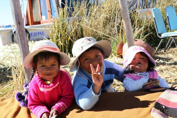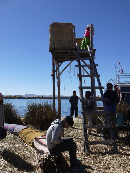 旅行團行程緊湊,介紹完居民生活、拍個照,接著自費坐蘆葦船,趁此空檔,我留在島上稍作漫遊。見三名黑皮膚、兩頰紅通通的小朋友在追逐玩耍,其中的小男孩還踢足球,便過去跟他踢,他也讓我踢球。他們一下就不玩了,順勢幫他們拍張照,小朋友很專業的擺出pose。又爬上瞭望臺,上面有位穿著傳統服飾的少女正在眺望遠方,見我上來,友善的向我示意:我可以待在上面,也願意讓我拍照,嘗試用英文問她幾歲,英文講得不錯,18 歲。等我們上船要回去時,踢足球的小男孩匆匆跑到船艙窗邊,與我揮手道別。