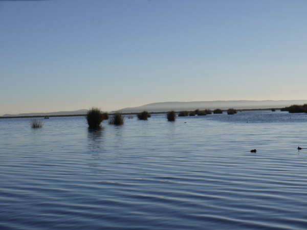 晨曦薄霧裡的的的喀喀湖,溫柔曼美,湖中長著蘆葦。
