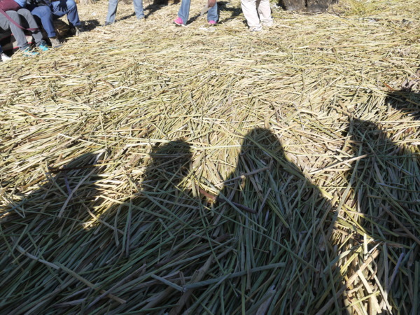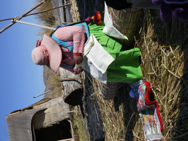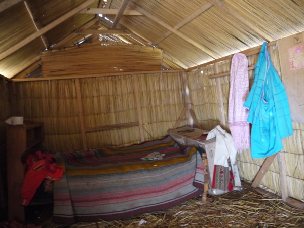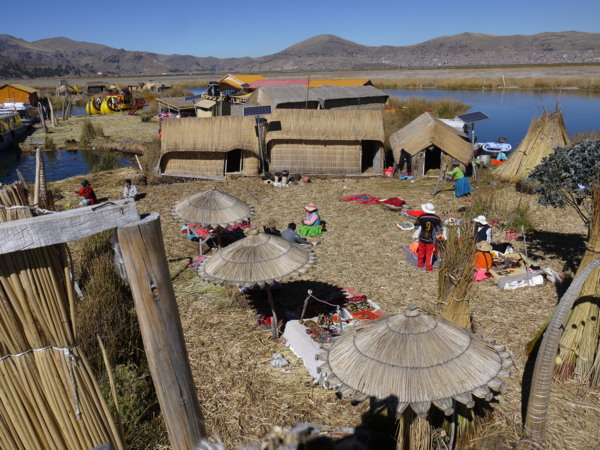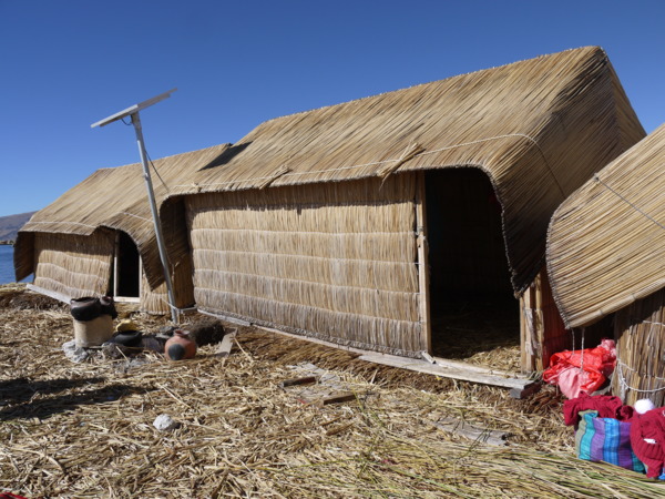 他們以蘆葦蓋房子,在房裡用火,怕發生火災,都在戶外炊煮。屋外直立的竿子是日裔秘魯總統藤森為他們舖設的太陽能板。