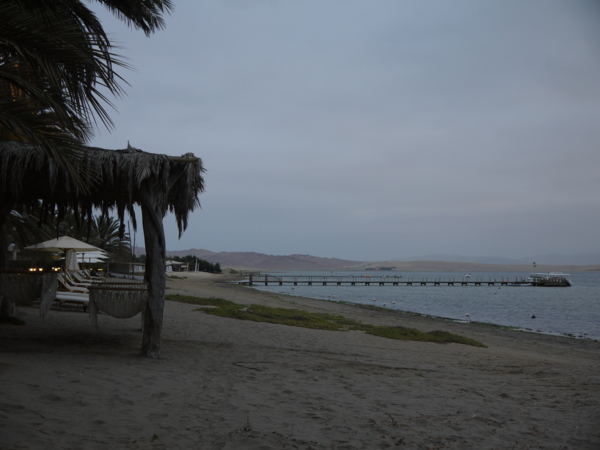 海灘設置座位、遮陽傘供房客玩水並小憩,遠方的浮橋盡頭是港口,明天要坐船看鳥島。