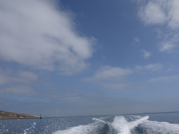 慢慢接近鳥島。陸地上鋪著青青白白灰灰的物質都是鳥糞。