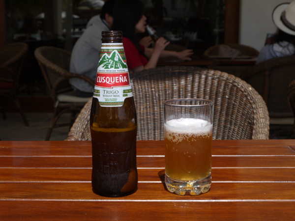 今天的午餐,體貼周到的領隊和導遊請我們喝秘魯啤酒,啤酒瓶頸子上的標籤,綠色部分是馬丘比丘的圖案。喝完啤酒後,我將酒瓶清洗晾乾,裝入行李箱中,帶回臺灣。