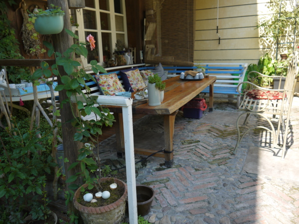 民宿主建築大門外左右兩旁,各有一方小陽臺。這是左邊的陽臺,照片左側水藍色鐵門是民宿入口。