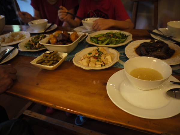 早晨7:30從無錫出發,友人丈夫開車,帶著老父、念小三的兒子等老小共五人上路,中途遇塞車,花費四小時車程才到臨安,民宿主人推薦一家農家樂午餐。農家樂是大陸農民開的小餐館,提供當地食材的餐食。
