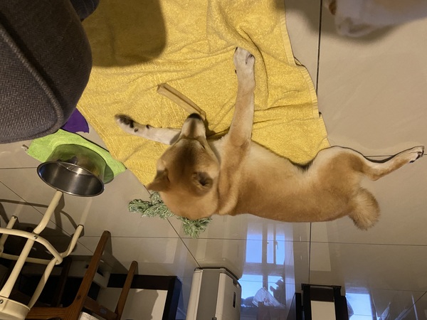 弄罐頭給賴皮吃,牠吃到剩一點,怎麼就是不肯吃光,決定不理牠,到廚房洗菜。背對著牠,想著不知道牠現在在做什麼,回頭看,牠正仰著頭看我呢,一邊用舌頭舔著嘴,好像在跟我說什麼似的,喔!牠盛食物的碗已經光溜溜的乾淨了,原來牠要告訴我,已經把罐頭吃光了。