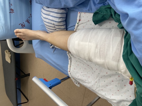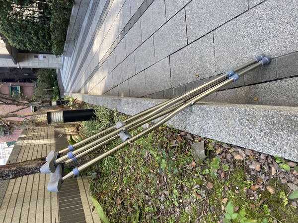 R進病房時,G姐已來探病,我與R提及,她就幫忙到今天,她請我再考慮考慮,便去幫我買拐杖、調整拐杖的高度,兩人一起攙扶我,讓我學習拄拐杖走路,骨折的左腳無法著地使力,全靠右腳踩地,我試著以拐杖平衡身體,以拐杖代步。躺床四天了,終於可以下床落地。