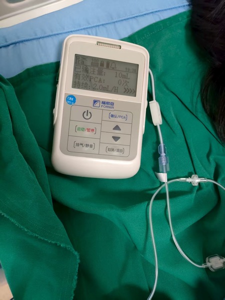 醫生來巡房,說我可以下床了;帥哥醫生昨天太忙了,沒進開刀房,不是他幫我開的刀。醫院使用止痛泵讓我們止痛,還是第一次看到這般醫療儀器。因為有止痛泵,開刀的傷口不感疼痛。