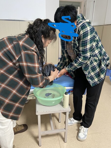 五天沒洗頭,頭髮髒亂打結,有夠狼狽,幸好新疆乾燥,頭髮不至於油到受不了。下午,Q妹體貼的帶來吹風機,要幫我和L洗頭、吹乾頭髮。Q妹在床邊擺凳子,放上裝熱水的臉盆,我們躺在床上,將頭伸出床緣,H姐扶住我們的頭頸,讓Q妹洗頭。出門前整理行李,神經兮兮的帶了一瓶洗髮精,竟在此時派上用場。