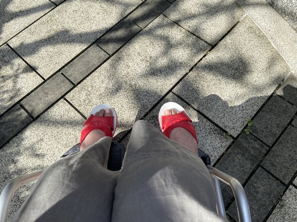 我帶了一雙輕便便宜的紅白拖出門,這種拖鞋缺少造型設計,給人廉價、上不了檯面的形象。當時評估這雙醜八怪拖鞋,既可減輕行李重量,若有損耗,必須丟棄,也不至於心疼。