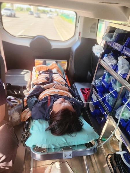 表妹Z到桃園機場接我。見到親人,抱著表妹哭了起來,不是委屈傷心,而是經歷層層磨難後,終於回來了。坐民間救護車回家,躺在車上,雖不知經過哪些地方,但刺耳的救護車聲響,陪伴我暢行到家。