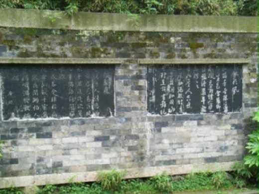 沈園內有一處非常有名,就是一片用沈園出土的斷磚砌成的石壁,上面刻有陸游的《釵頭鳳》詞,這可是沈園的造園主題。我聽在場的導遊講解說是陸游部份是當代詞學家夏承燾依陸游的字跡重新書寫刻上,而唐琬的部份則是想像女人的筆跡而模仿刻上去的。如今的沈園已非當年的沈園,如今的石壁也非當年的石壁,如今墨跡也非當年的墨跡,但不管如何,那段千折百回的悲慘愛情故事早已深烙在大家心中,沈園已變成大家隔著時空憑弔懷念的美麗園地。