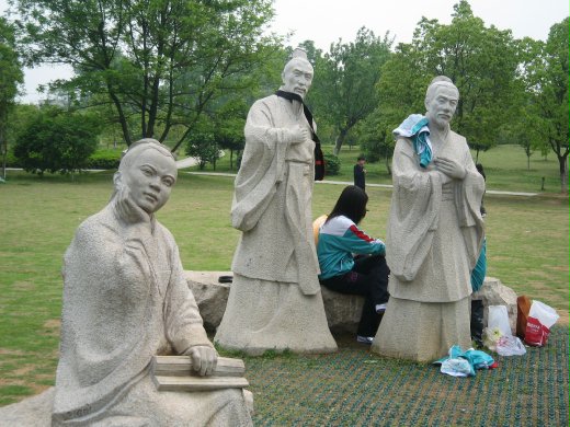 衢州府山公園內有鐘靈塔、環映榭、蓮花池、天主堂等這些美麗景物,園內林木綠意盎然,亭台樓閣曲徑通幽,但是令我印象最深刻的是孔子授業雕像群。這和隔街相望的孔氏家廟當然是有必然的關聯性。府山公園孔子授業群雕反映的是孔子周遊列國中授業之「情景」,而非在課堂講學那樣的正襟危坐,所以弟子或坐或站,都很寫實生動,且眼神、表情、神態均專一注視著孔子。雕像有七名弟子,不知是否和孔子最有名的七個弟子有關。我覺得遊客加入其中一起聆聽孔子面授,不也是一幅有趣的畫面。