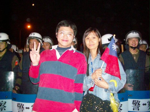 2004年的4月3日晚上8點我又重回凱達格蘭大道,在3月21日起到3月27日那段時間,我有空就會到現場抗議那場骯髒的選舉。這次重回現場,不僅是要聲援那群為了公理正義奮鬥到底的群眾,而且還要親眼目睹整個抗爭過程,我不相信那群擁有滿腔熱血的同胞會是民進黨口中的暴徒,我要親身證驗,公佈事實。雖然我只是個手無縛雞之力的弱女子,但是為了對抗惡勢利,我會堅持到底的。