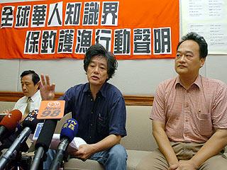 照片:民盟教授夏鑄九(中)、郭中一、劉源俊(左)串聯華人知識界發表聲明,呼籲政府保釣護漁,並拿出相關報導日本古地圖佐證釣魚台不屬於日本。(黃國書/20050627)