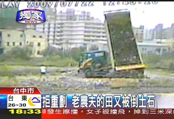 日前報導,台中市一位15歲小女生,在部落格寫下「阿公拒絕交出稻田,配合開發公司自辦重劃,結果稻田被傾倒土石,阻塞灌溉水源」!新聞曝光後,這位阿公的稻田周圍,又被倒了2車土石,老人家氣得希望市長胡志強能夠幫幫忙。
