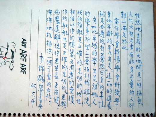 李老師幾乎是要帶我去上易經課了,又怕礙著我的天真,方才打住。 我翻出她為我紀念冊題的「單純能使人恬然地生存於天地間,是一種福氣。大仁、大智、大勇,有終身之憂的人卻難以滿足於此。 當妳學會輕揚,學會舒發,學會此年齡的平凡自足,這一切的進展就是合適的,有驀然回首的喜悅。」李老師,謝謝妳在我十五歲時,出自愛心的憂慮,能告訴妳而今我又看山是山,看水是水了?
