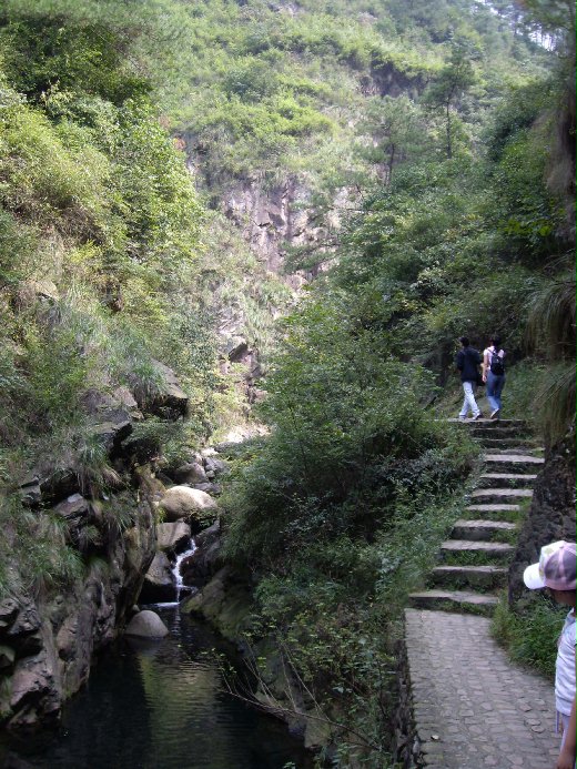 石景峽谷帶是一側山一側水的健行路線,走在山徑上,身邊是清澈的溪流,一段階梯後是一段平路,走在樹蔭下很涼爽,若經過沒樹蔭的地方,小孩就會抱怨好熱。山路除了階梯,平路之外,還有小型懸空棧道,以及大石斜坡,走起來還蠻有趣味的。路上常有小水庫形成的水潭,可喜的是水非常乾淨,健行路線的終點是天池,以及一個瀑布。