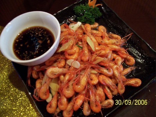 服務生安排我們坐在包廂中,包廂寬敞地方也乾淨,我好不容易紓了口氣。首先上桌的是鹽水蝦,像台灣吃到的溪蝦,一旁的沾醬是黑醋。這是活蝦下去煮的,感覺先炸過,新鮮就會好吃。翔跟廷也很愛,廷本來堅持要老公剝蝦殼,結果吃了一隻帶殼蝦之後,就很高興的自己挟來吃了。