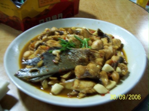 計乘車到飯店服務生推薦的餐廳,叫做漁家樂,跳表價RMB25元,四周有點空曠冷清。餐廳老闆在路邊接我們,原來要自公路旁小路下斜坡,一下斜坡便是千島湖邊,湖畔整排錯落著船家菜餐廳。老板領我們走過浮橋,浮橋兩側養著魚,先請我們選魚,因為只有兩大兩小,我們決定要小一些的魚,可是有機魚生著一個大頭,小的魚也有五六斤以上,小魚只能做兩吃-魚頭煮湯,魚身紅燒。老闆請員工自池中撈起一條魚,擊昏後送入廚房料理。至於其他的菜餚,老闆請我們到廚房現場點,仙姑怕現場點菜法,雖知老公一點菜就很水瓶座,仙姑還是不想進去廚房。