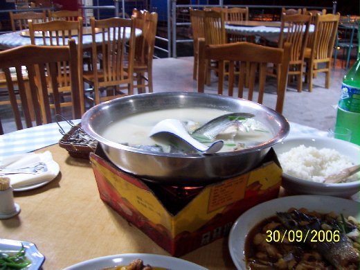 餐廳的座位在湖面上,晚風清爽。寶寶們很興奮,一直要去看魚。餐桌上放著熱茶與瓜子,這裡似乎很愛吃瓜子。老公回來後,他另點了蔬菜,以及一隻雞。所以說,我們兩大兩小今晚的晚餐是:六斤重的魚,五斤多重的雞,還有一盤青菜。