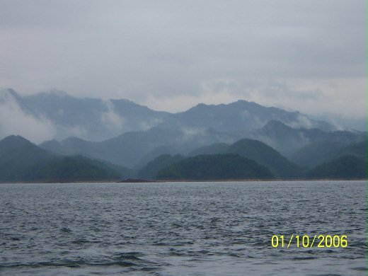 遊罷梅峰島,我們坐著子爵號遊湖,天空飄起細雨,湖面上罩著薄霧,往遠處望去,湖面與水面因霧氣連成一氣。千島湖中諸島錯落分佈,霧氣靄靄飄於其間若細雲,原以為山那頭便是邊際,船更行進,發現山後有山、山後有湖,真個無邊無際。