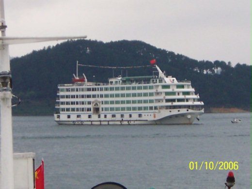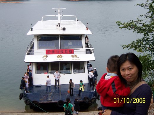 遊島完畢回到船上,一同回伯爵號用餐,此時船艙內的空氣就很糟糕了,抽菸的,吃烤魚的(島上的外帶小點是烤魚),全家到頂層甲板好了。回到伯爵號享用了一餐有趣的Buffet,我們吃飽後也上伯爵號最高層甲板坐定,涼風襲人,舒爽自在,十一假期已經進入高潮,我們能在伯爵號覓一方天地賞湖,比起上回五一的旅遊,品質大有進步。