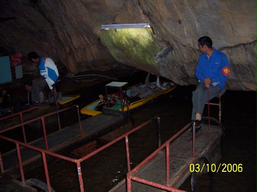 雙龍洞前的隊伍是為"臥船進洞",我們在入洞前便向翔寶貝魔音洗腦:待會兒要乖乖躺在船上。入洞後順著樓梯向下,大家停在一處四面山石環繞,前方有水,沒路可去之處,細看發現,前方的大石下面有水道,臥船便自大石下方穿出,遊客依序躺在船上進雙龍洞。船下之水清澈見底,四人共躺一舟,我們一家正好四口,廷躺我身邊,翔在老公身邊,臥船進洞整個時間約兩分鐘,小船起點終點兩邊都有繩子拉著,船行緩慢平穩,躺在船上穿過大石下方,感覺山石貼面而過。於是我們便進入廣闊的雙龍洞了。