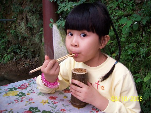 雙龍洞與冰壺洞的景緻幽美,我們邊走邊讚嘆,出了洞口才發現已達半山腰。接著要參觀的桃源洞需走下山,沿途坡度平緩,當森林浴也是有趣。桃源洞是奇石景致洞穴,走了一圈出來後,聽說下一個洞穴朝真洞在遠方的山頭,若步行前往需一個多鐘頭,小販們都建議我們搭接駁車,可是老公非常高興有健行可走,此時已是中午吃飯時間,路邊的竹筒飯看來頗美味,於是我們先在路邊吃午餐,吃飽再開始健行。出朝真洞在路邊吃午餐:竹筒飯,蒸糕,茶葉蛋,後來發現口味還真不錯,於是又加點竹筒飯與茶葉蛋。