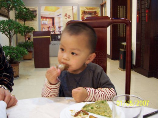 五月一日晚餐,我們全家有大吃大喝的心情:假期第一天,午餐只吃粽子,下午健行數公里,因而要用豐盛晚餐,慰勞一天辛勞。仙姑出發前上大眾點評網,聽說下塌的國貿飯店二樓餐廳很實惠美味,然而,一進到飯店大廳,就碰到兩組新人迎客,廷還默默在心中品頭論足,比較哪個新娘較美,哪套禮服較漂亮。仙姑欣慰自己教育有成,廷後來小小聲的告訴我右邊的新娘比較漂亮,這是很大的進步,以前廷會大聲嚷嚷,太傷害另一位新嫁娘。因為二樓賀客滿座,我們決定在一樓用餐,也是中餐廳,記得先前看過資料,有人把一樓的用餐處稱為”食街”,實地到訪,其實不是我認知中的美食街,一張張桌椅也擺放妥當,環境雖稱不上豪華精緻,但也寬敞輕鬆;一桌桌用餐人聲鼎沸,別有一番假期熱鬧氣氛。點菜處是一道道樣品展示,佈置的清潔,看了食慾大振。老公點了手撕鴨與牛肉薄餅,我請老公陪伴小孩,我跟著服務人員,點齊晚餐所有菜色。菜色選擇真的很多,仙姑肚餓失手,點個太多吃不完。