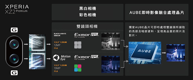 Xperia XZ2 Premium搭載高解像力的雙鏡頭,為了完美及時呈現每張照片或每段影片,特別開發獨家的AUBE即時影像融合處理晶片,可即時處理雙鏡頭所擷取照片及大量影片資料,透過運算後,可以即時呈現高品質的照片及影片。