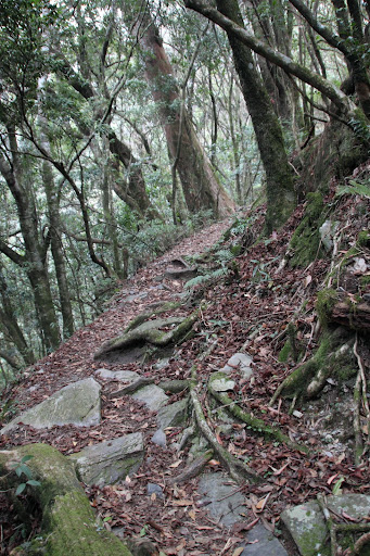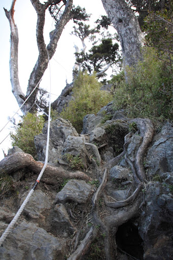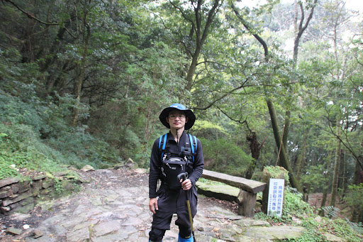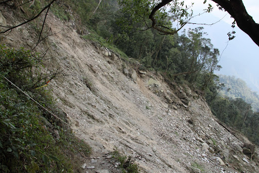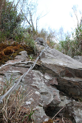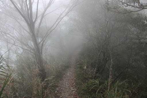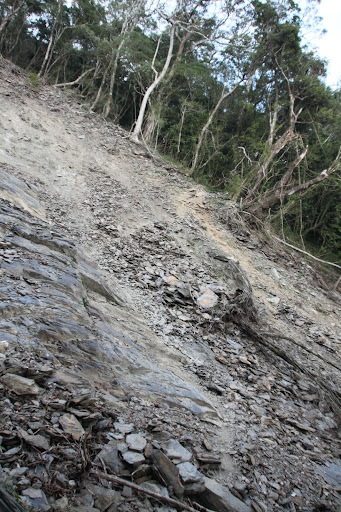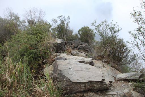 自林道0.5K後至2.5K間,因風災也有多處大小的崩塌路段,通過時須謹慎小心....,約3K至3.8K為陡上路徑,因多背了2人帳篷走起路來感覺吃力些....,在3.8K裸岩上因雲霧已近瀰漫整個山頭,故無視也可欣賞,只能繼續往山莊前去了。