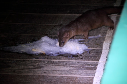 山莊因部分設備故障未修,故目前無水,可於附近谷中取水(後來知道蓄水桶亦可取水),谷中水質清澈冰冷。用過晚餐並與山友們閒聊後,約晚上8點多便躲入睡袋睡覺了....。突然間山友的嚇阻聲叫醒了我,原來是有隻黃鼠狼跑進來,並撞倒山友煮好的一鍋冬粉(有肉有丸子),躲在床底不時的探出頭來偷吃,費了(拍照)半個多小時便又繼續睡了。