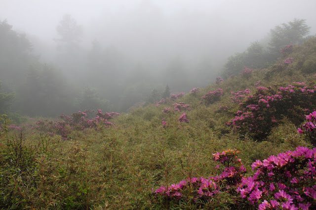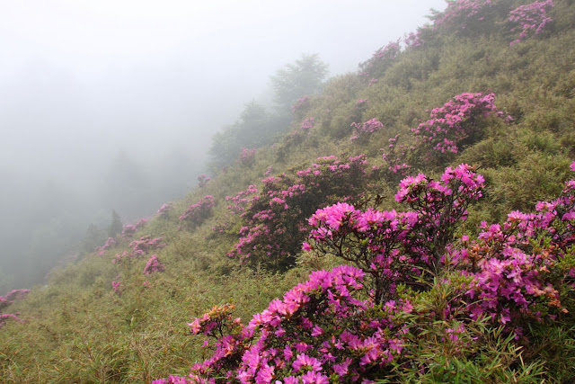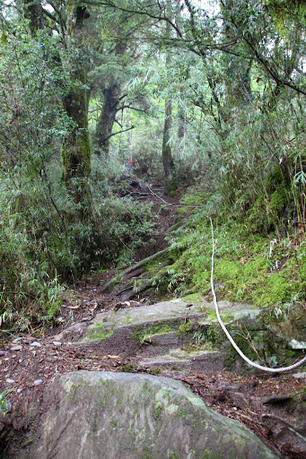一個個拉繩而上。愈是往上,高山杜鵑的範圍愈大,真是稍稍舒緩了疲累