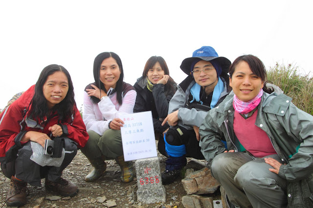 約5分鐘後便抵達畢祿山三角點(高度3371公尺),到此一無展望,大伙們只