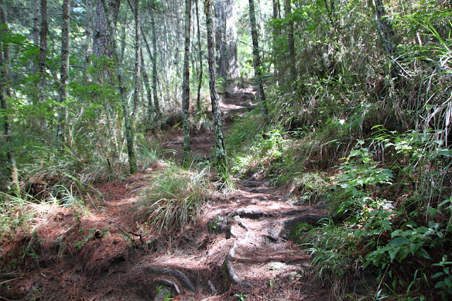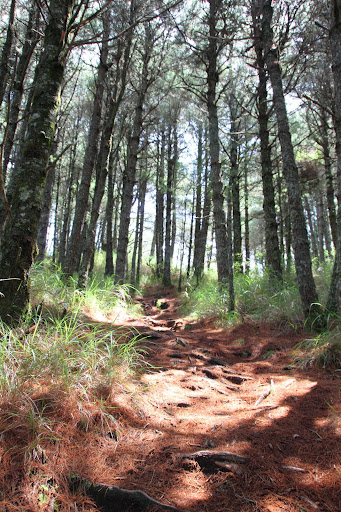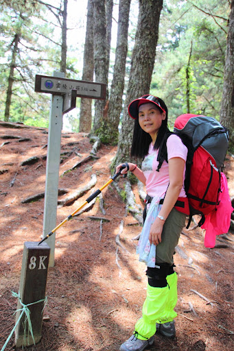 從登山口至松風嶺(8K)雖只有1.2公里,但爬升高度卻要3百多公尺,一路大都是之字形的陡上。陡 上步行了將近1個小時後便抵8公里處的松風嶺,看著由軟軟的二葉松落葉鋪成的林道,霎時除了拍照外更是在 這軟軟的床墊上躺了起來,此時真是讓人忘卻了疲憊的身軀與身處在大自然舒暢的感覺。約500公尺山坡上有 著指標:登山口1.7K,雲稜山莊3.2K,其旁邊有間避難山屋,可供臨時避難遮蔽使用。