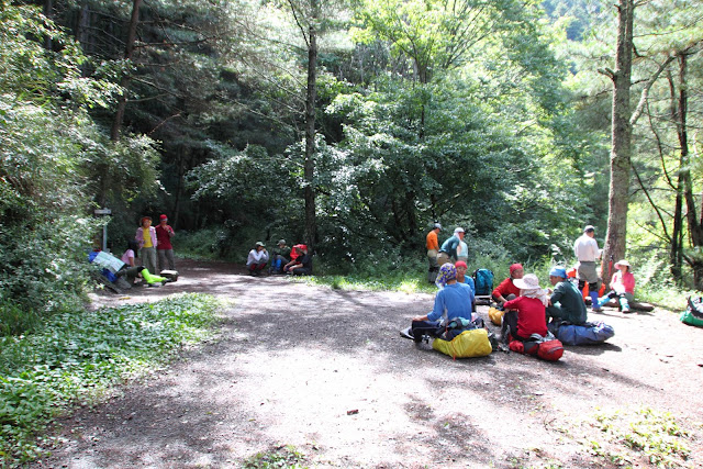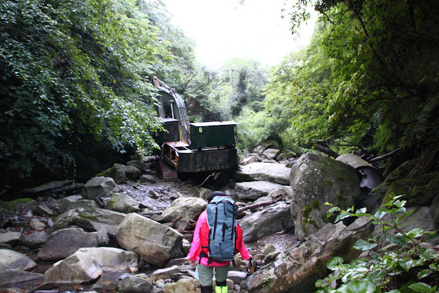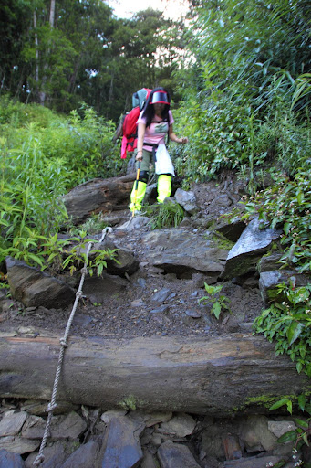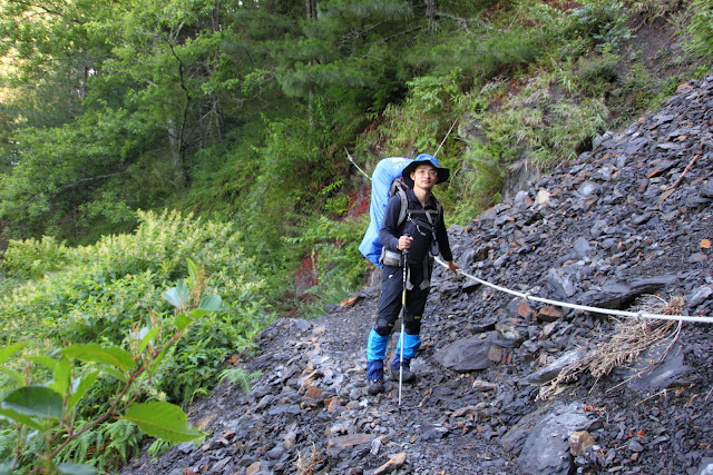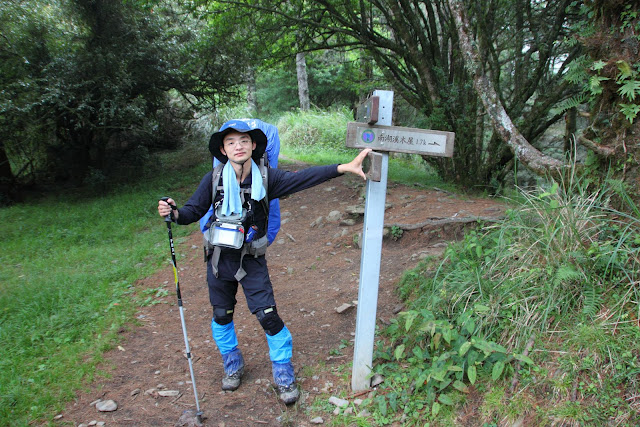 7月15日 清晨約4點30分起床,在稍作盥洗後便用起早餐,此時另一隊伍也已陸續整備中。整裝完成後便與子雲姐於登 山口拍完照後於6點6分先行出發,從思源啞口起登距離雖多了2公里,但走起來較為緩坡、舒暢,自登山口柵 欄出發不久後便會經過一處溪底與傳說中的挖土機,接著便是溪的上游,此地水質清澈。