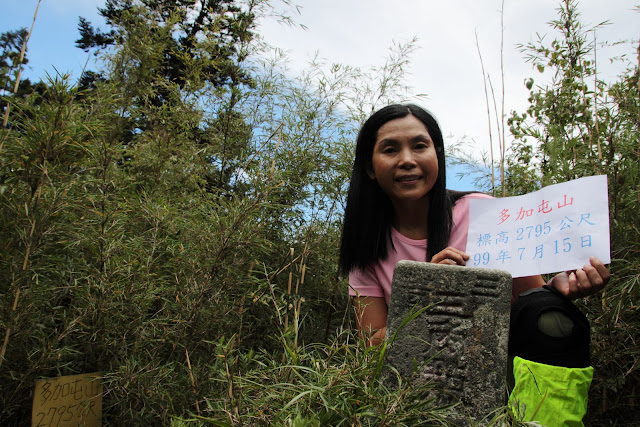 步行一會便抵8.6公里處的多加屯山水利三角點(標高2730公尺),剛好在必經的路上故順道拍個照 留念囉~~。因前方需經多加屯山,故便開始往上步行,在抵多加屯山叉路時需留意旁邊的石頭標記(約在9.5公 里里程碑過後不久),我們因一時沒有注意便擦身而過至拉繩處下方不遠處,考量回程有不確定因素,故只能 放下重裝再回頭攀繩而上至叉路口,再上行至多加屯山(標高2795公尺),因腹地小且無視野可看,故拍完基點 照便往回走了。