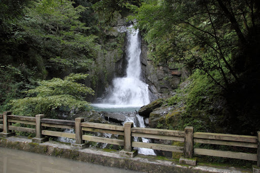 林道橋旁一處較大的瀑布,且積水佔滿橋上四周,須延橋旁柱子一格格通過
