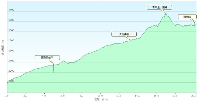 D1:屯原登山口至->天池山莊->奇萊南峰&南華山之步行高度示意圖