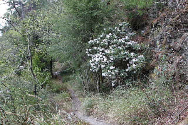 仍無湛藍的天空景色,為林道中偶時幾株高山杜鵑綻放著,尤其是在靠近畢