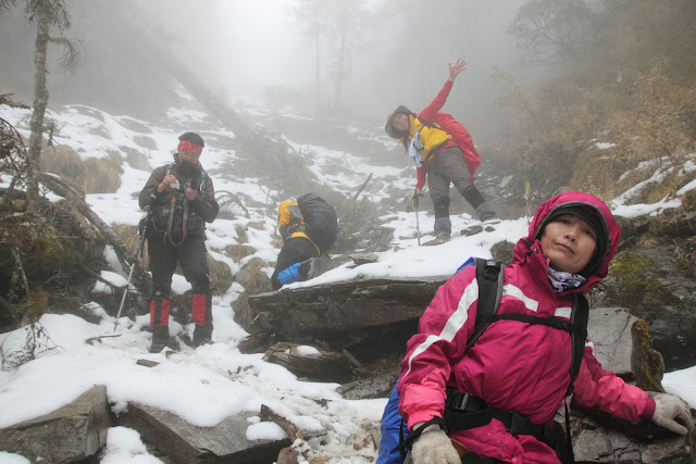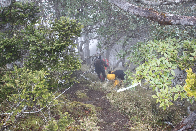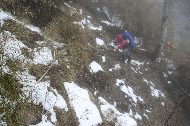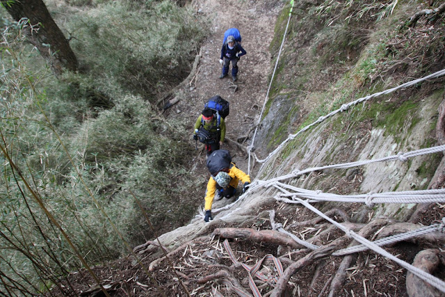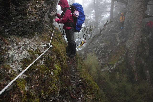 時都得拉繩攀著岩壁而上。一路上仍是濃霧瀰漫、飄著霧雨並無景可欣賞,